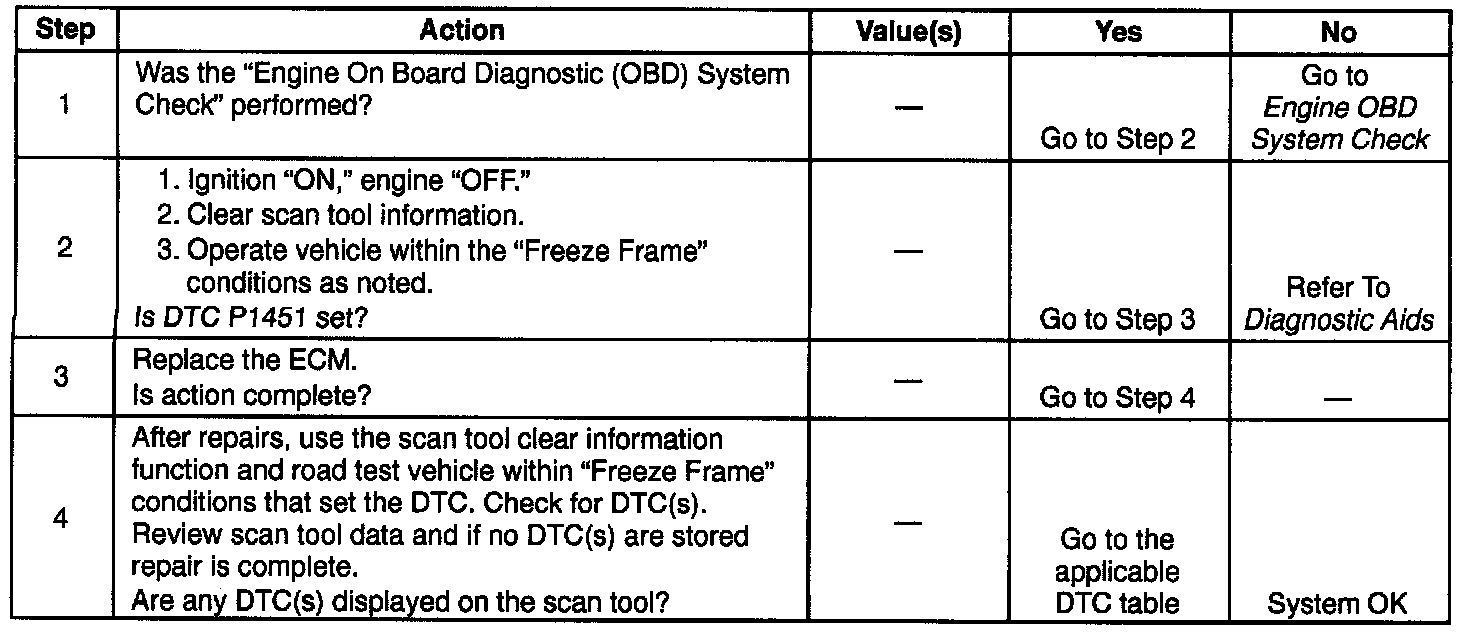 If DTC P1451 cannot be duplicated, the information included in the Freeze Frame data can be useful in determining vehicle operating conditions when the DTC was last set. This may assist in determining how often the DTC sets.