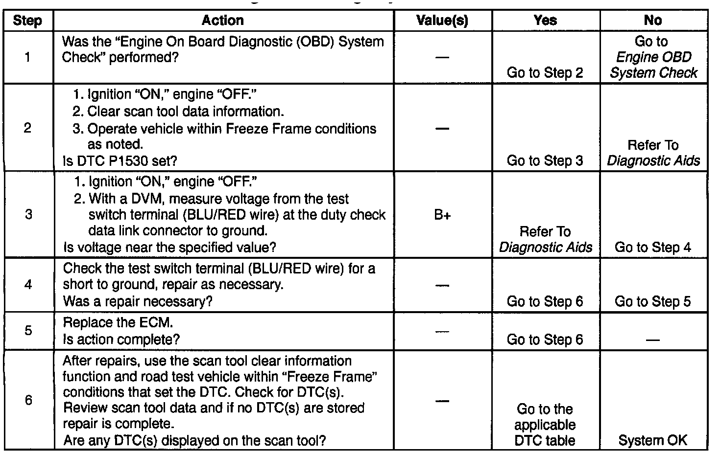 If DTC P1530 cannot be duplicated, the information included in the Freeze Frame data can be useful in determining vehicle operating conditions when the DTC was last set. This may assist in determining how often the DTC sets.
