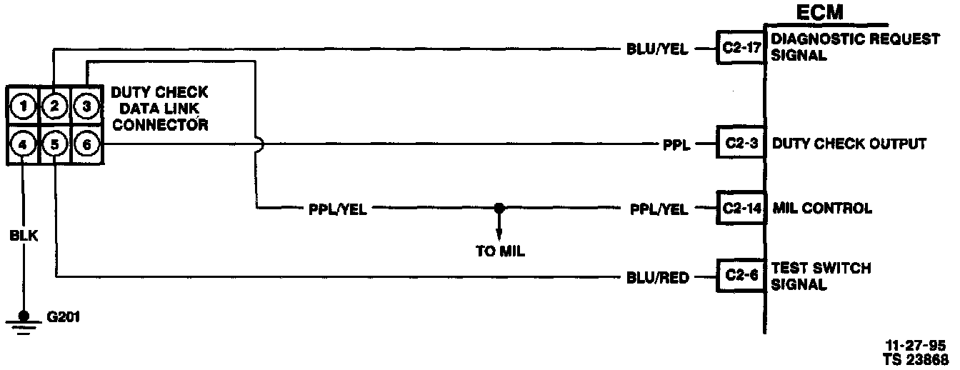 The test switch terminal is located in the duty check data link connector. When the test switch terminal is grounded the ECM fixes the Ignition timing to base timing.