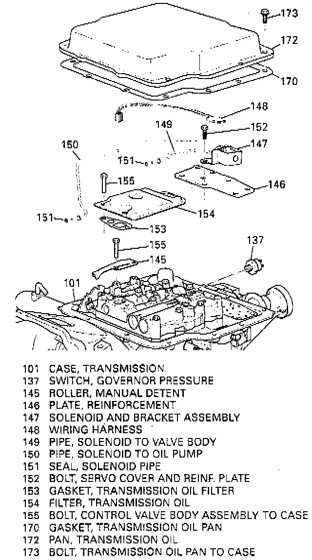 5. Solenoid pipes (149 and 150) from the control valve body assembly (128) and the case.