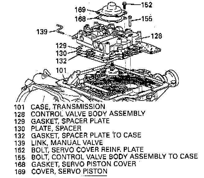 9. Bolts (155), control valve body assembly (128), and manual valve link (139).