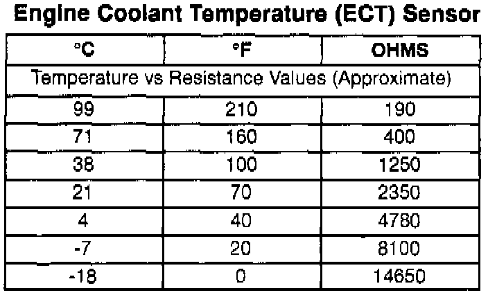 - When replacing the ECT sensor the Temperature to Resistance Value scale may be used to test the sensor at various temperature levels to evaluate the possibility of a shifted (incorrectly calibrated) sensor. A shifted sensor could result in poor driveability complaints. Refer to Computers and Control Systems for additional ECT sensor specifications.
