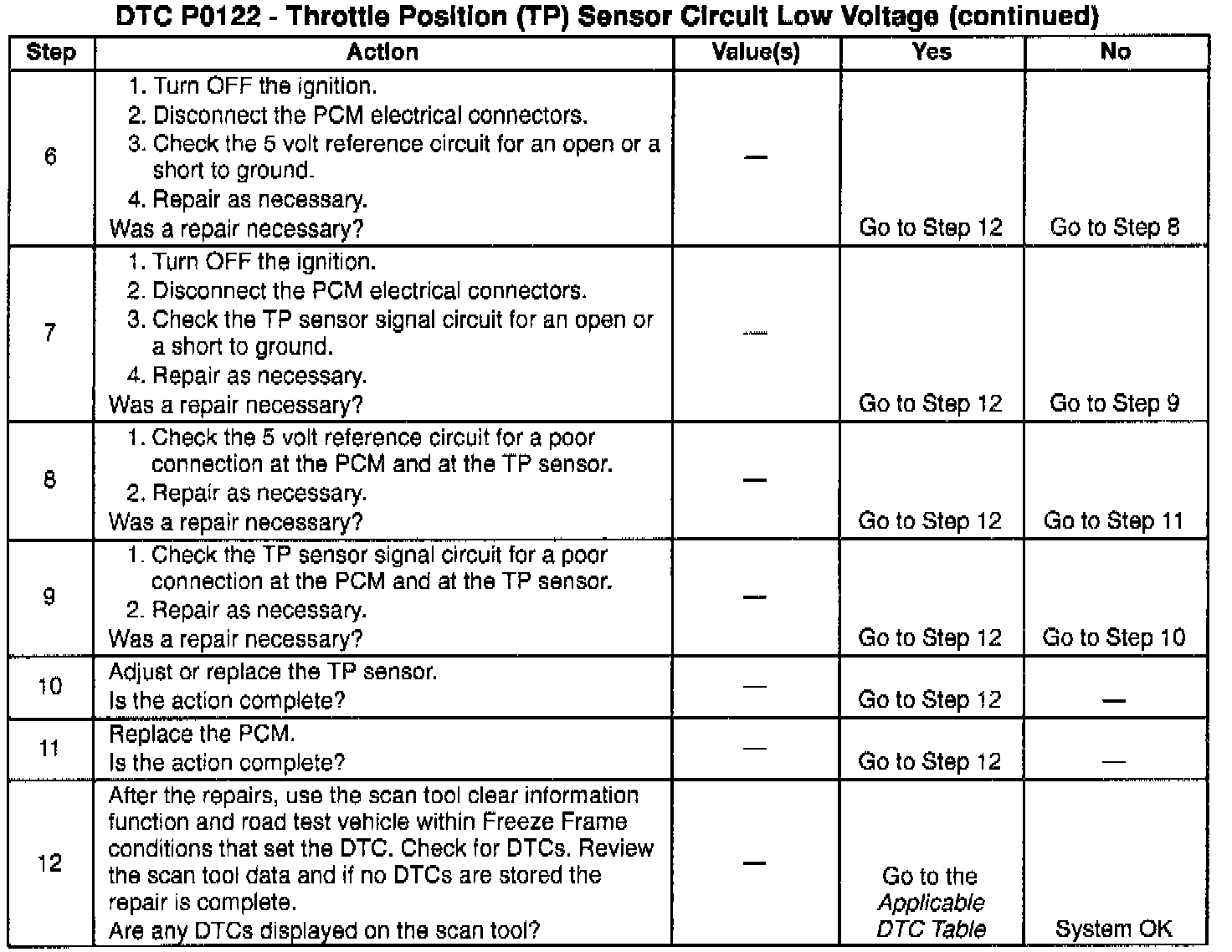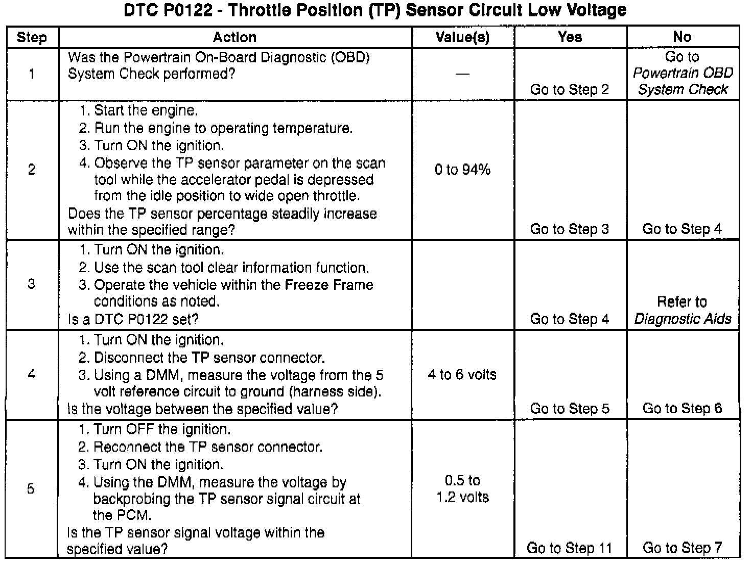 If the DTC P0122 cannot be duplicated, the information included in the Freeze Frame data can be useful in determining vehicle operating conditions when the DTC was first set.