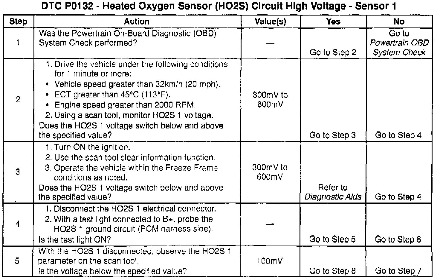 The Heated Oxygen Sensor (HO2S) produces a voltage that varies between 100 mV and 900 mV under normal operating conditions. The Powertrain Control Module (PCM) monitors this voltage and determines if the exhaust is lean or rich. If the voltage input at the PCM is about 100 mV the exhaust is lean, and if the voltage input is about 900 mV the exhaust is rich. The PCM constantly monitors the HO2S signal during closed loop operation and compensates for a rich or lean condition by decreasing or increasing fuel injector pulse width as necessary. If the HO2S 1 voltage remains excessively high for an extended period of time, DTC P0132 will be set.