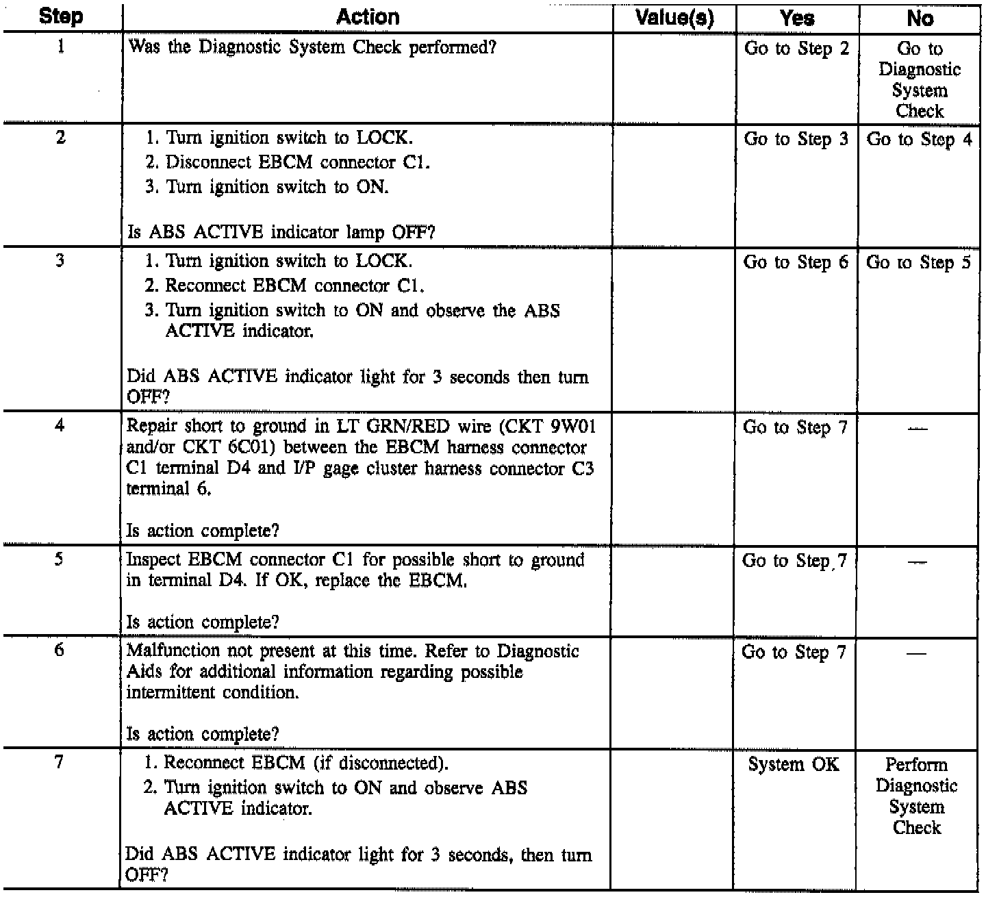 ^ Short to ground between EBCM and the ABS ACTIVE indicator lamp (CKT 9W01 and/or CKT 6C01).