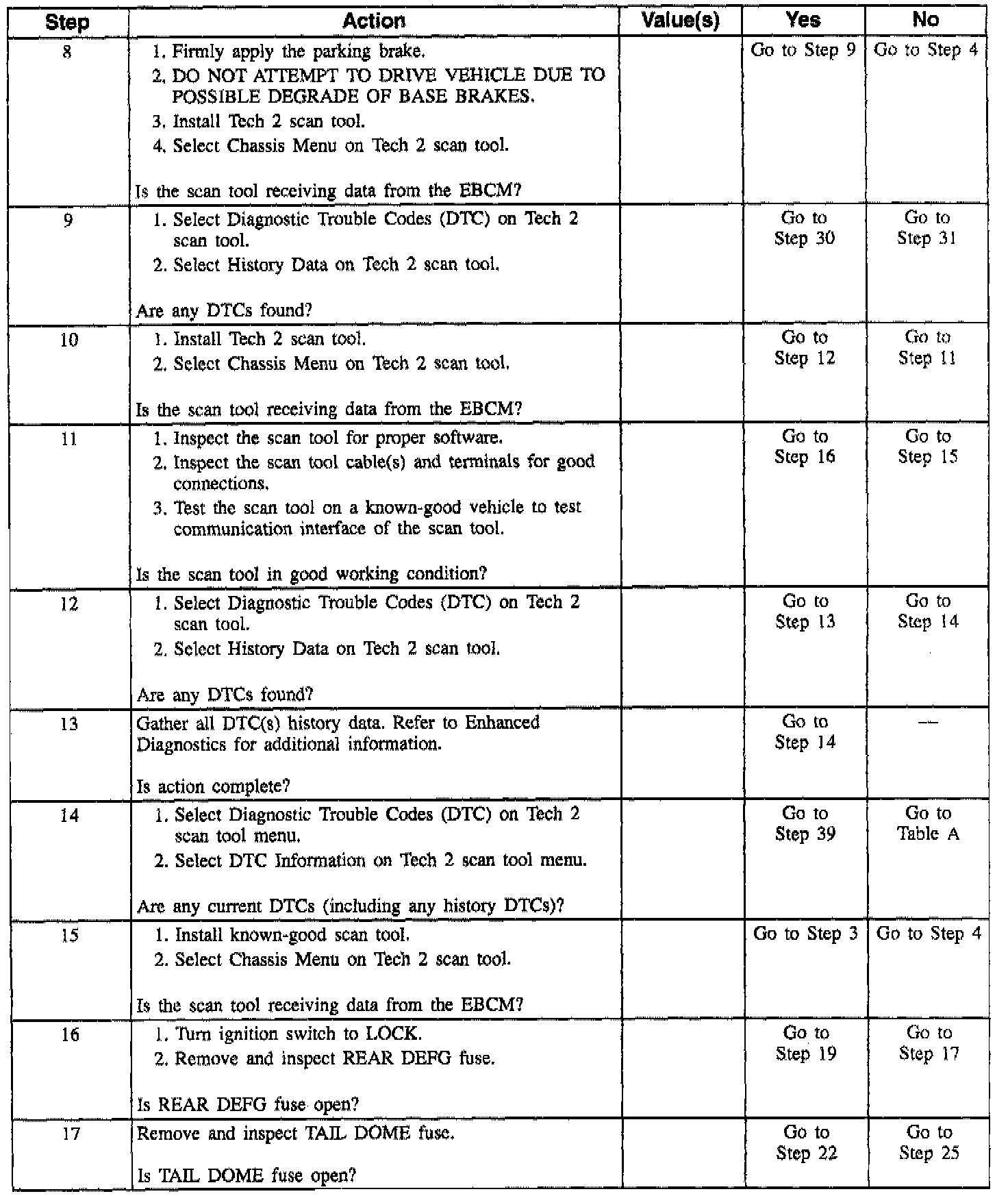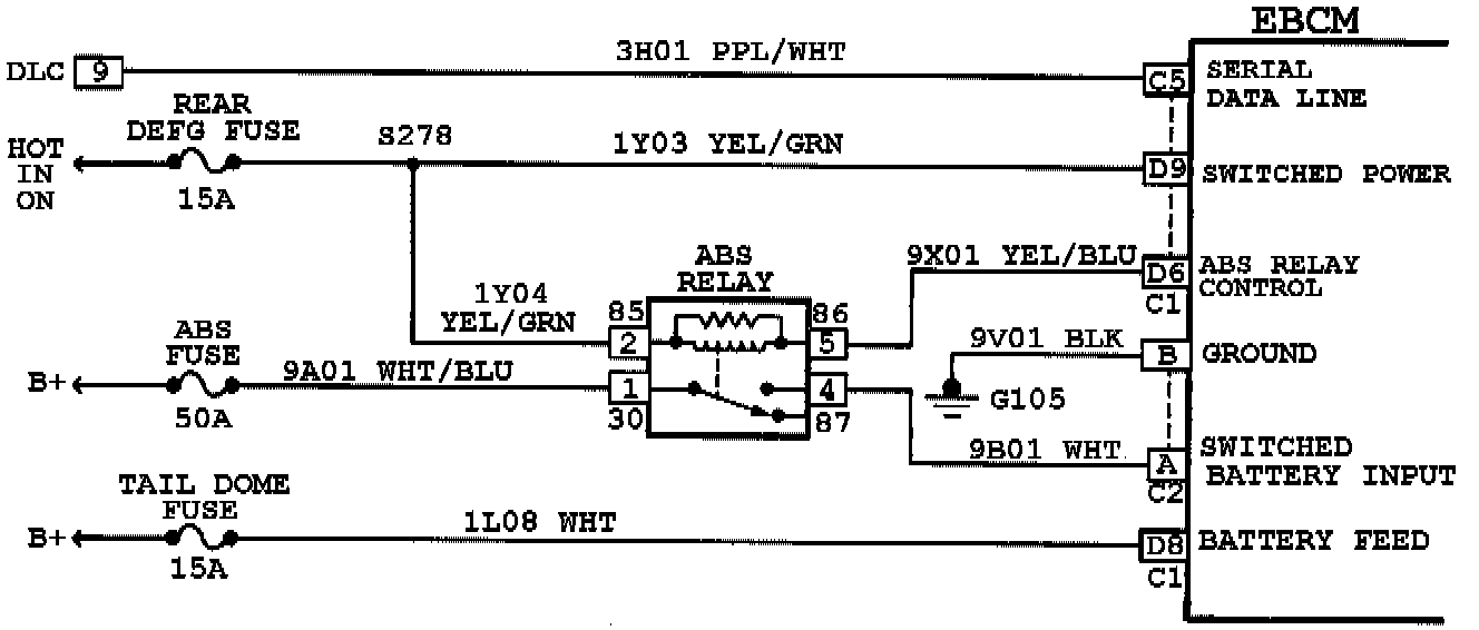 NOTE: If communication with the EBCM is not possible with a scan tool, ensure that the above circuits are in good condition and that there is no excessive resistance. Also check EBCM connectors C1 and C2 for poor connector terminal contact.