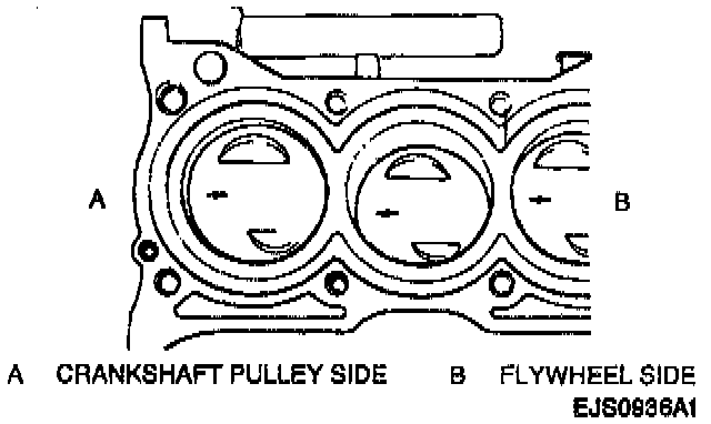 NOTE: On each main bearing cap, the arrow mark and number are embossed. When installing each main bearing cap to the cylinder block, point the arrow mark toward the crankshaft pulley side and install each cap from crankshaft pulley end to flywheel in order 1, 2, 3, 4 and 5.