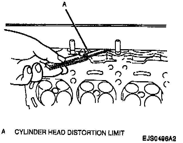 4. Distortion of manifold seating faces. Using a straightedge and a feeler gage, check seating faces of intake and exhaust manifolds on cylinder head. Distortion limit is 0.10 mm (0.004 inch). If distortion cannot be brought within limit by resurfacing, replace cylinder head.