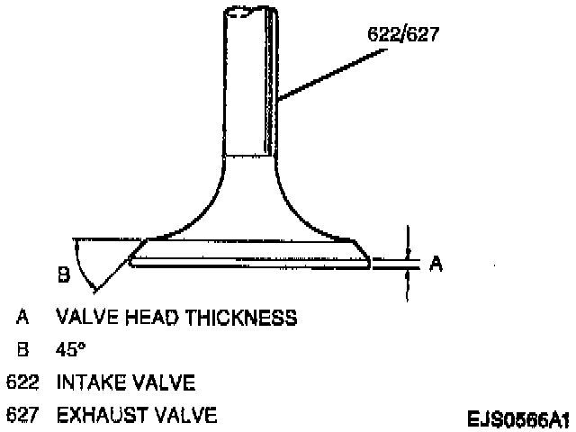Thickness of all valve heads using a steel scale. The standard valve thickness is 0.8 to 1.2 mm (0.03 to 0.047 inch). If the intake valve thickness is less than 0.6 mm (0.024 inch), replace the intake valve. If the exhaust valve thickness is less than 0.7 mm (0.027 inch), replace the exhaust valve.