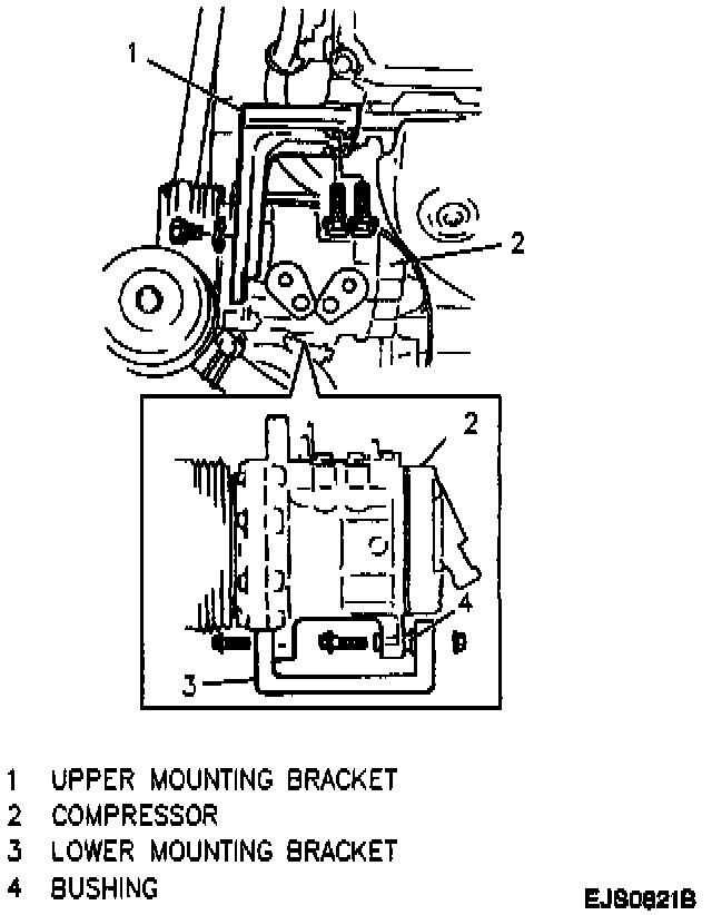 1. Compressor to vehicle; secure with two lower bracket-to-compressor mounting bolts. Do not fully tighten.