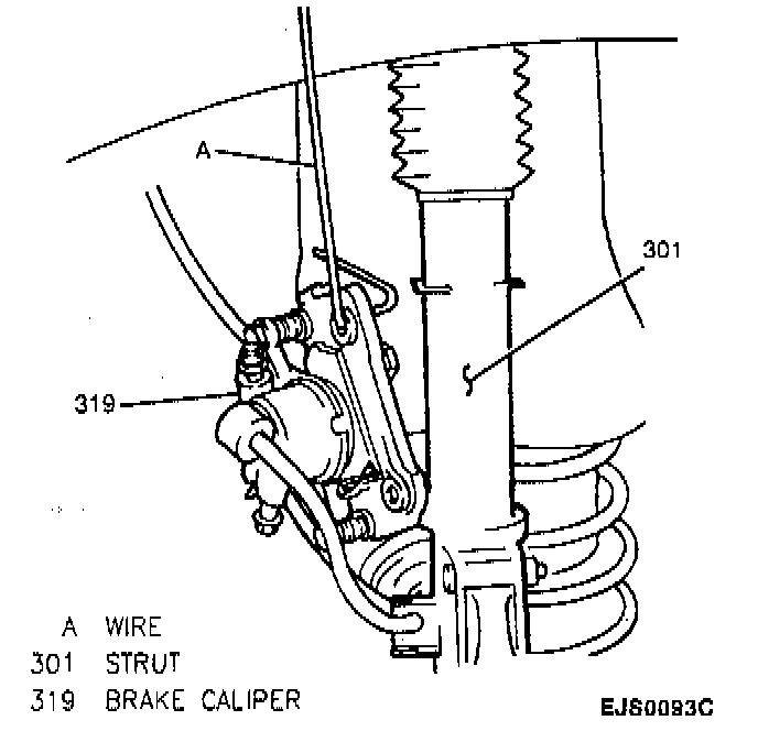 3. Brake caliper from rotor and steering knuckle by removing two caliper carrier bolts. Suspend caliper assembly with wire so as not to damage brake hose.