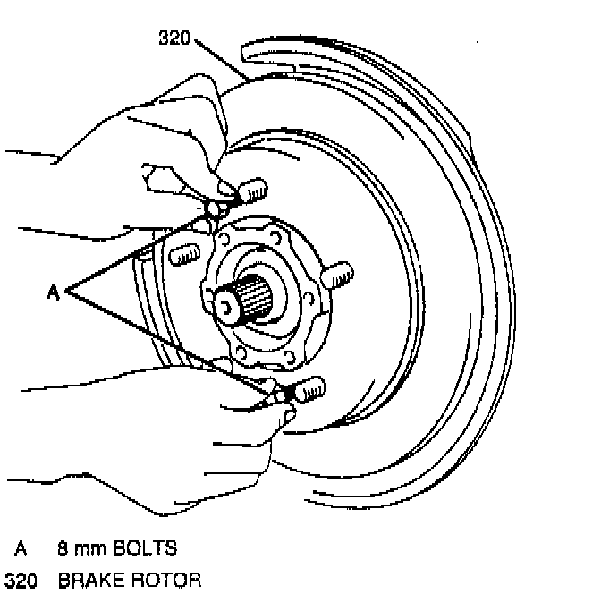 4. Brake rotor from wheel hub. If rotor cannot be removed by hand, install two 8 mm bolts into rotor. Tightening the bolts will force rotor off.
