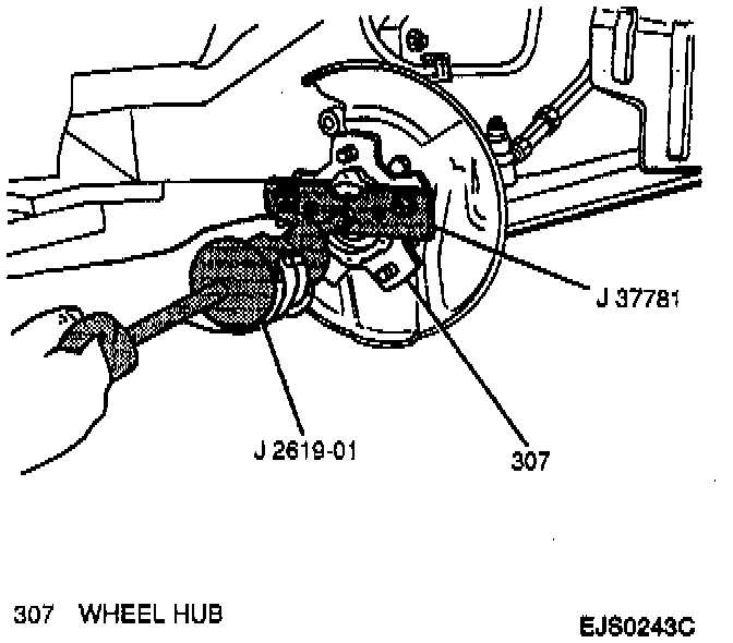 11. Wheel hub complete with bearings and oil seals from spindle. If wheel hub cannot be removed by hand, use J 37781 with J 2619-01.