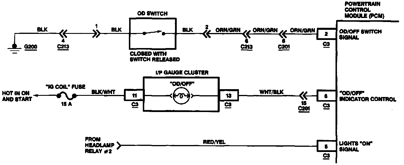 When the ignition switch is turned to the ON position, the Powertrain Control Module (PCM) performs a three second OD/OFF indicator bulb check by ground the OD/OFF indicator control circuit during such period. When the OD switch button is in the released position, it grounds the OD/OFF signal circuit to the PCM. This causes the PCM to ground the OD/OFF indicator control circuit, turning on the OD/OFF indicator lamp located in the I/P gage cluster. This indicator informs the driver that the transmission will not shift into overdrive (4th gear). When this indicator is on and parking lamps/headlamps are turned on, the PCM dims the OD/OFF indicator lamp by adding additional internal resistance to the OD/OFF indicator control output circuit. This reduces excessive glare to the driver from the OD/OFF indicator lamp at night. When the OD switch button is pressed, it removes a path to ground to the OD/OFF signal circuit. Then, the PCM turns off the OD/OFF indicator lamp and the PCM adds overdrive (4th gear) to the shift schedule.