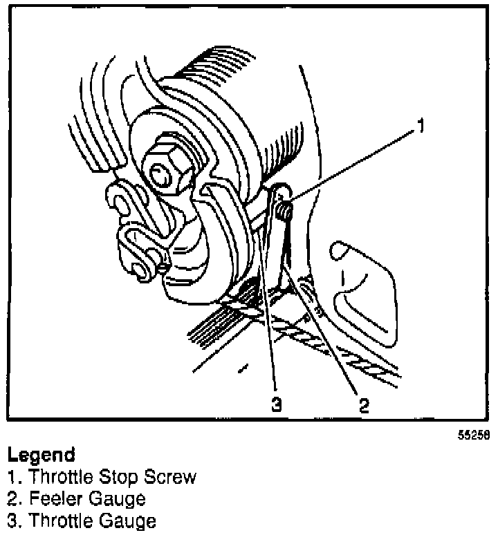 3. Insert a 0.65 mm (0.026-inch) feeler gauge between the throttle stop screw and the throttle lever.