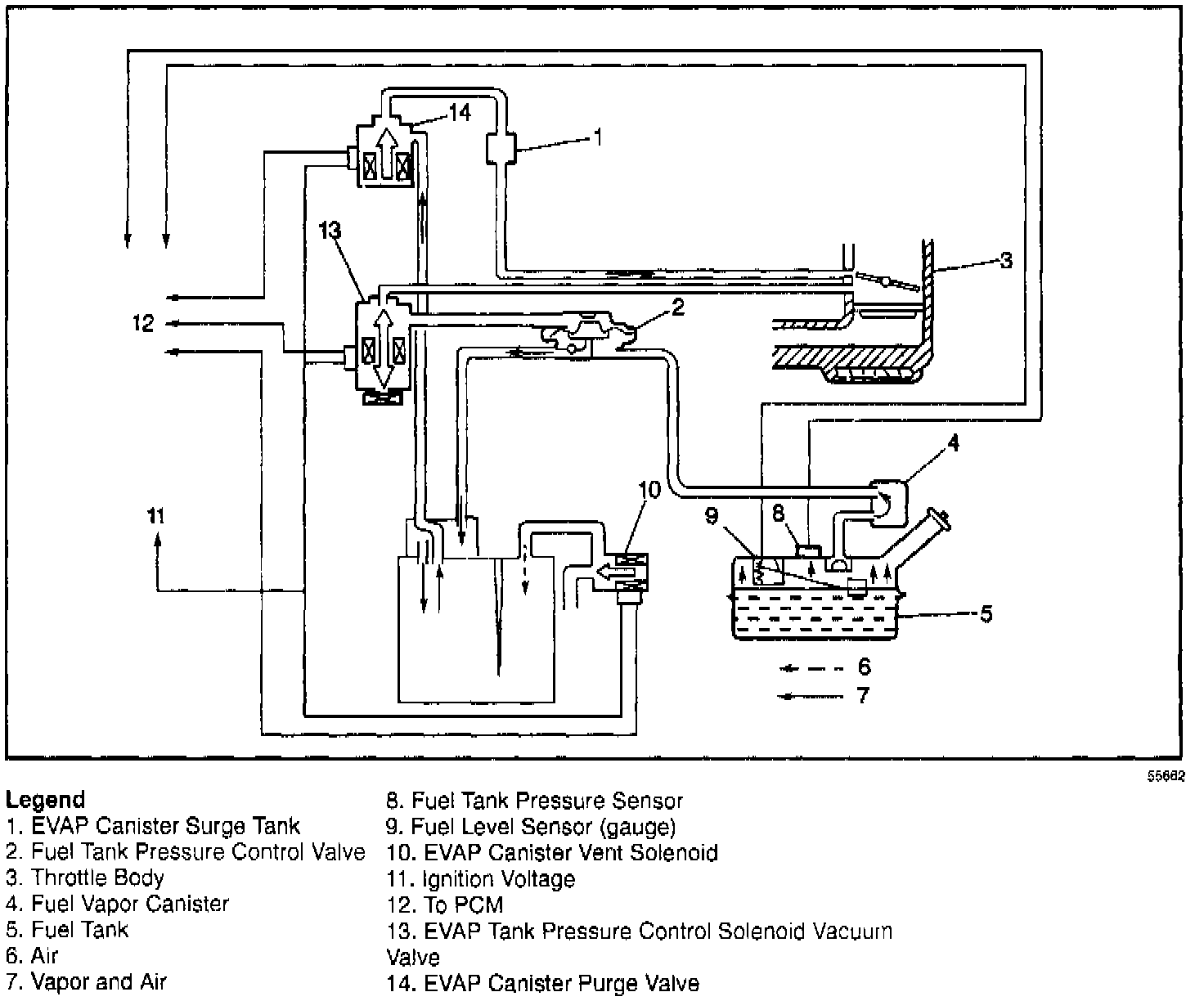 The fuel vapor generated in the fuel tank while driving or idling, passes through a Tank Pressure Control valve and enters the EVAP canister where a charcoal element absorbs and stores the fuel vapor.