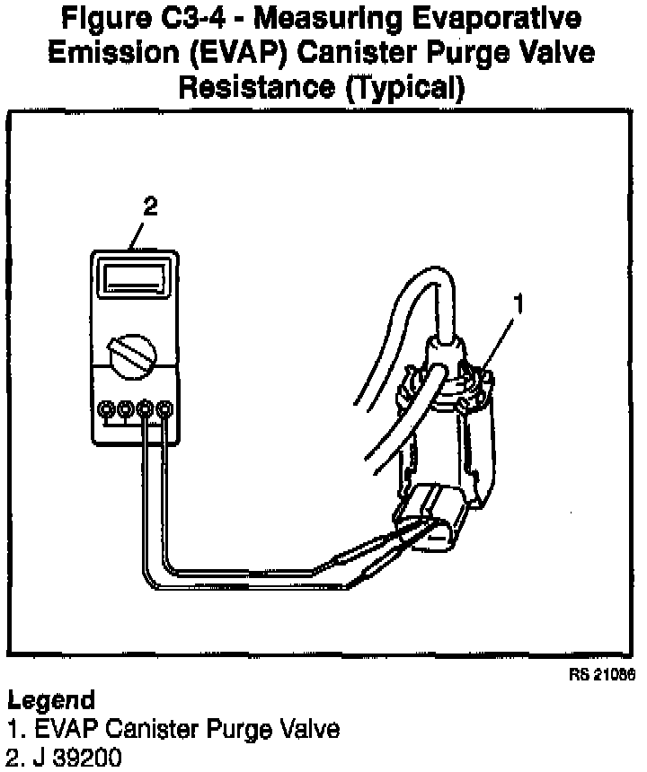 2. Using J 39200, measure resistance of the EVAP canister purge valve between both terminals. If resistance is not 28 to 36 ohms at 20°C (68°F), replace the EVAP canister purge valve. If the resistance is within specification, proceed with step 3.