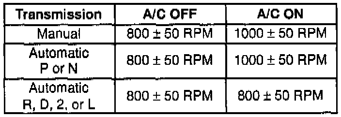 11. Check that the specified idle speed is obtained with the A/C ON (If equipped with A/C). Refer to the Idle Speed Setting table. If the idle speed is not as specified, check A/C idle-up circuit and Idle Air Control (IAC) valve circuit.