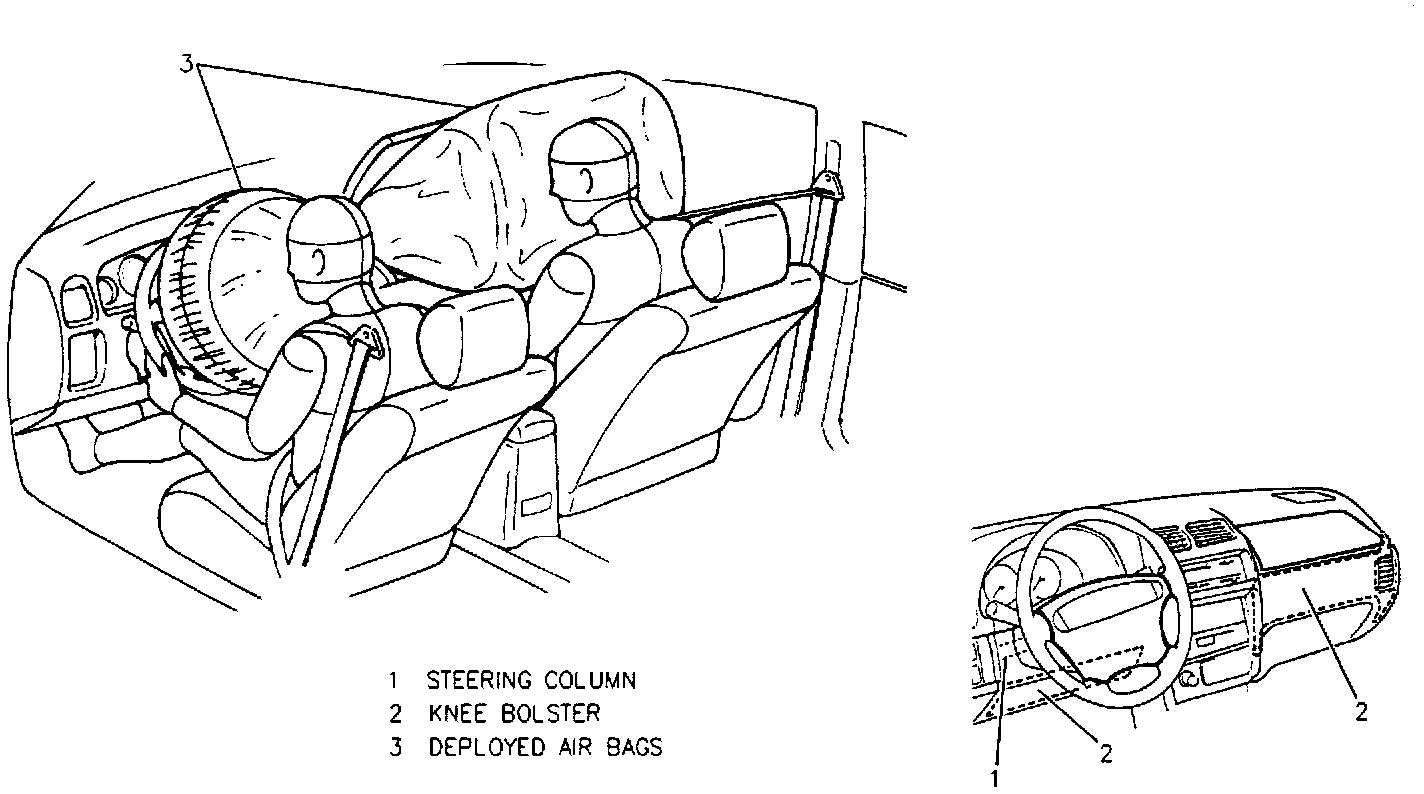 A frontal crash of sufficient force up to 30 degrees off the centerline of the vehicle will deploy the air bags (Figure 2). The knee bolsters absorb crash energy. The driver and passenger knee bolsters are below the instrument panel. The steering column is collapsible.