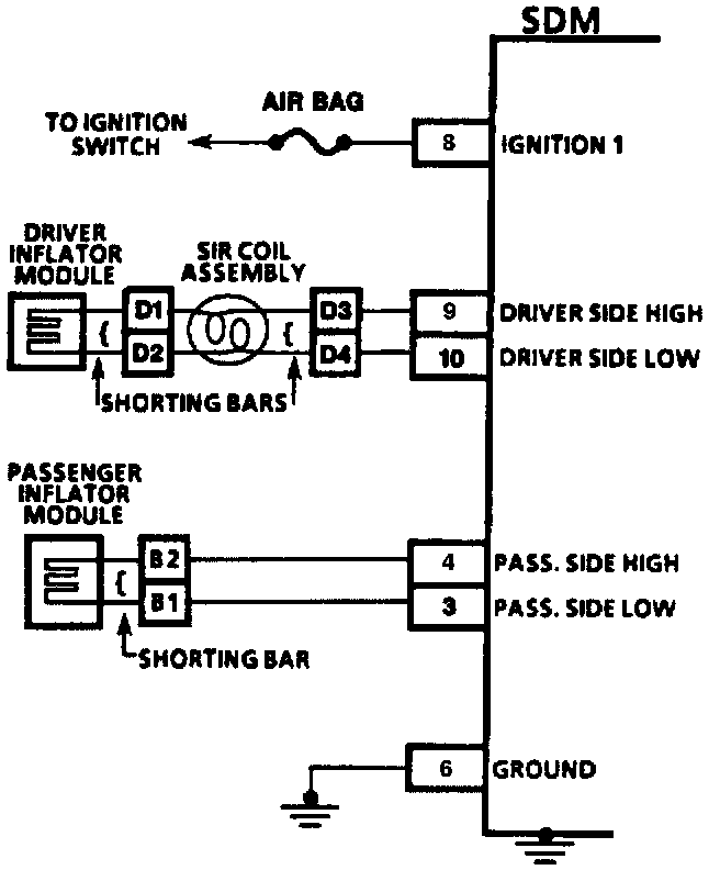 The inflatable restraint Sensing and Diagnostic Module (SDM), inflatable restraint steering wheel module coil, inflatable restraint steering wheel module, inflatable restraint I/P module, and the connecting wires make up the deployment loops. The function of the deployment loops is to supply current through the inflator modules, which will cause deployment of the air bags. Deployment occurs when the SDM detects vehicle velocity changes severe enough to warrant deployment.