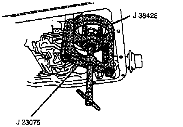 7. The J 23075 in conjunction with J 38428 onto the transmission case with the offset of the J 23075 facing toward the corner of the transmission.