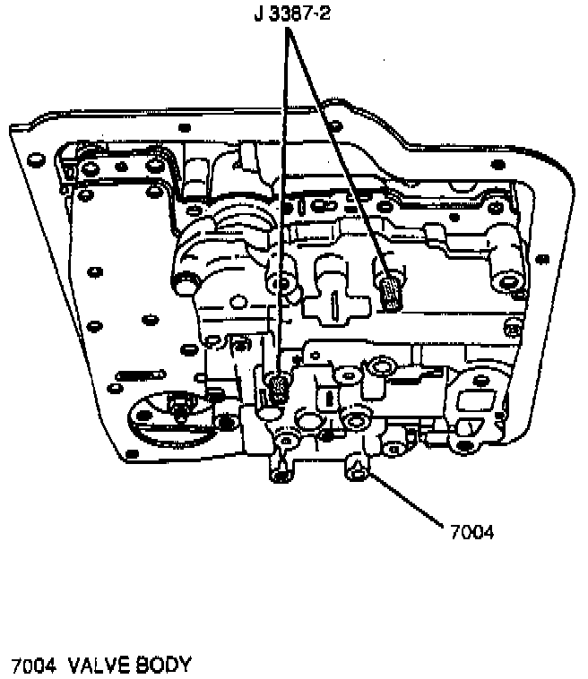11. Check ball, transfer plate gaskets, transfer plate, valve body and manual detent roller onto transmission case aligning valve body with transmission case using the J 3387-2; secure with nine bolts.