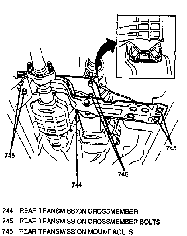 - Tighten rear transmission crossmember bolts to 60 Nm (44 ft. lbs.).