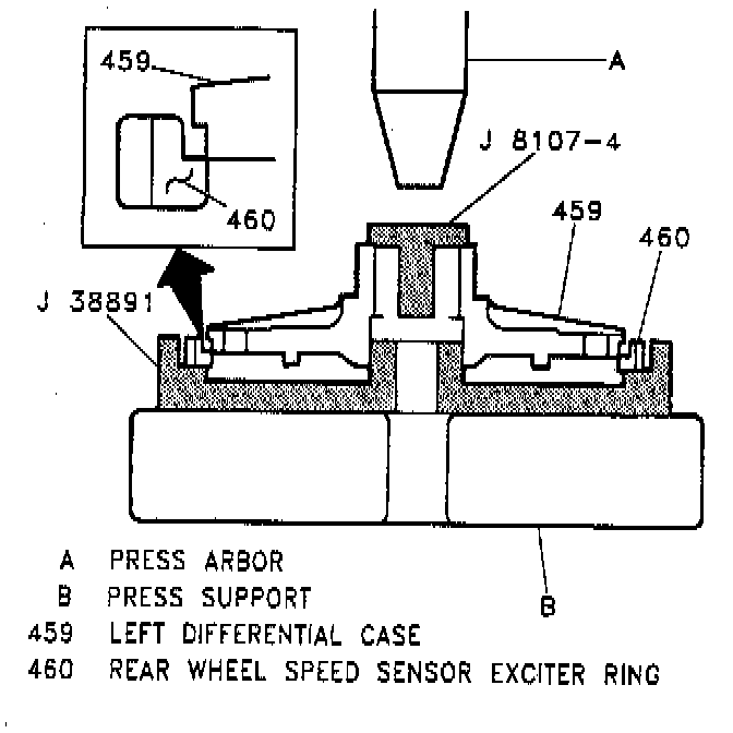 1. Rear wheel antilock (ABS) speed sensor exciter ring onto left differential case half using J 38891 exciter ring installer and J 8107-04. Place the exciter ring inside the J 38891 on a hydraulic press. Then, center the left differential case half in the exciter ring with J 8107-4 side in the left axle shaft bore and slowly press the left differential case half evenly into the exciter ring.