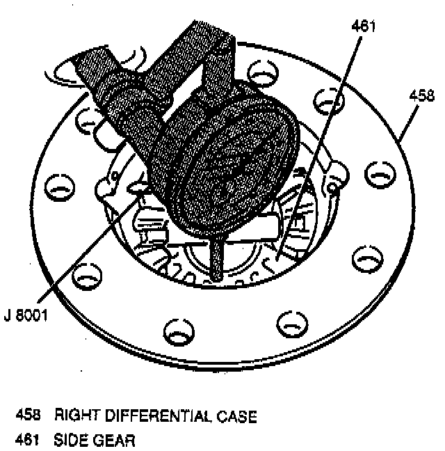^ Right differential side gear end play using J 8001. Insert fingers through the bottom openings of the right differential case half and move the right differential side gear up and down while observing the J 8001. Right differential side gear end play should measure 12 to 37 mm (O.OO5 to O.O14 inch). If right differential side gear end play is too high or low, replace the selective shim with the appropriate size to obtain correct end play.