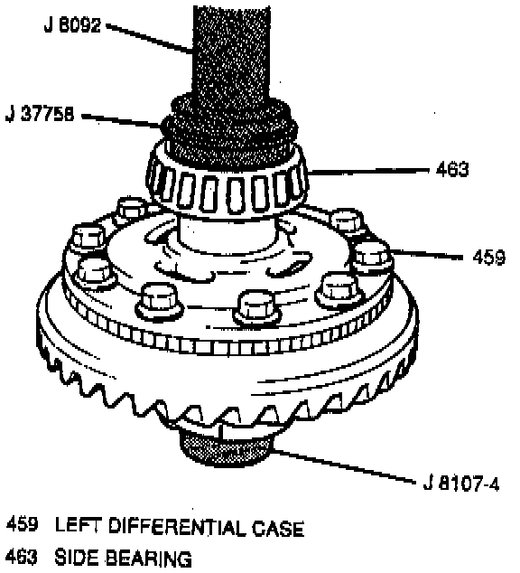 - Left differential side bearing to the left side of the differential case assembly using J 37758 with J 8092 and J 8107-4. Place the differential case assembly on a hydraulic press with J 8107-4 for support and to protect the right differential side bearing. Then, using the J 37758 with the J 8092, place the left differential side bearing on the left differential case with the taper side up and slowly press the left differential side bearing evenly onto the left differential case.