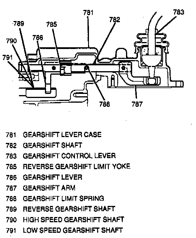 Gear selection is transmitted from the gearshift control lever into the gearshift lever case located at the rear of the transmission. The gearshift lever case contains a gearshift arm, a reverse gearshift limit yoke and a gearshift lever. These three components are attached to the gearshift shaft. The gearshift control lever is fitted into the gearshift arm. When the gearshift control lever is moved, the gearshift arm, gearshift shaft and gearshift lever are moved forward, backward, left or right depending upon the gear selected.