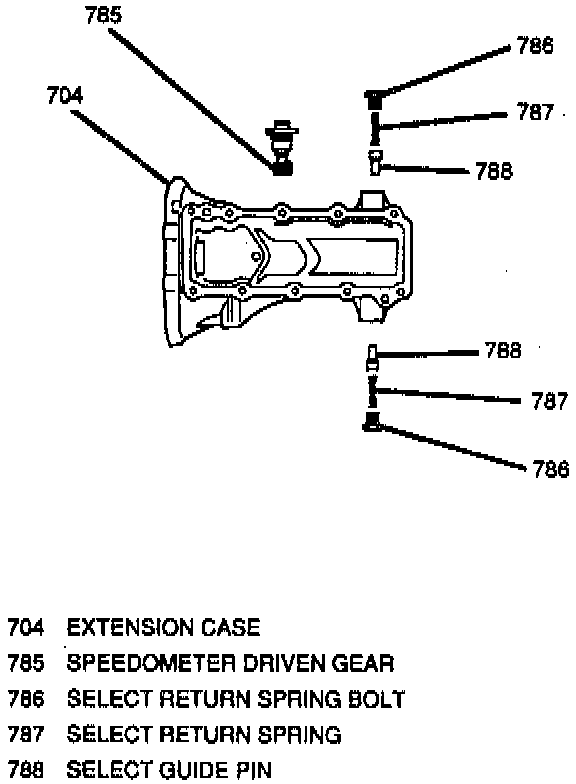 3. Two select guide pins, two select return springs and two select return spring bolts into extension case.