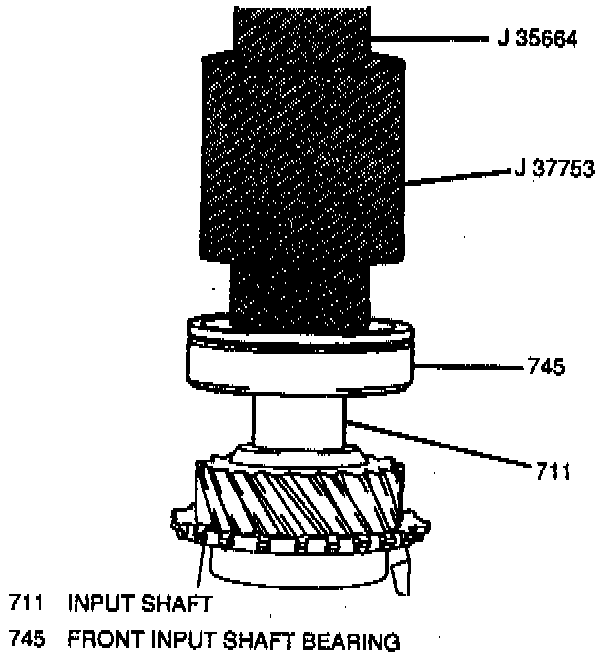 3. Front input shaft bearing onto input shaft using J 37753 with J 35664 and a press arbor.