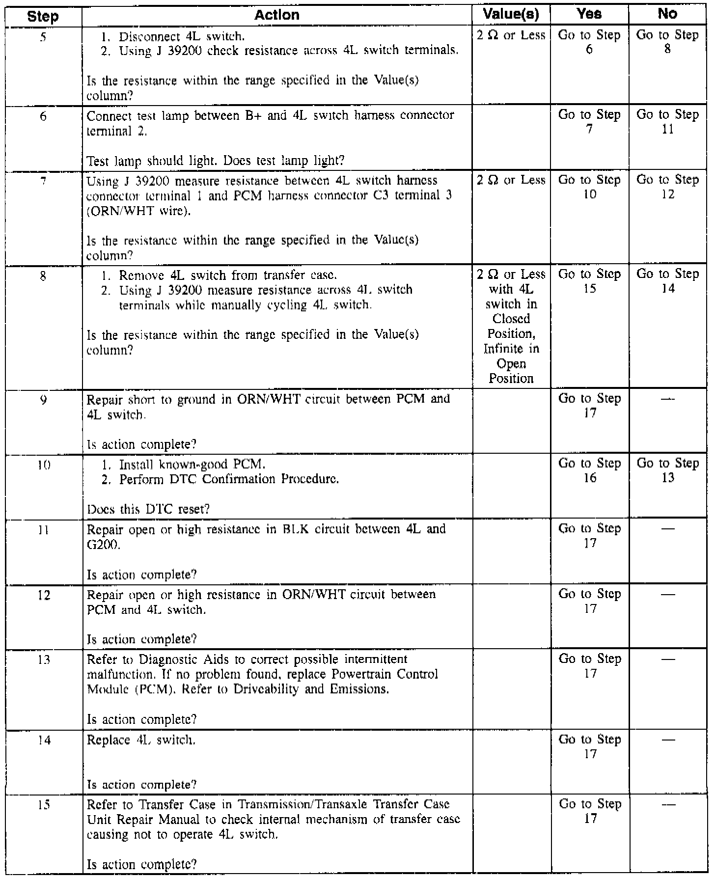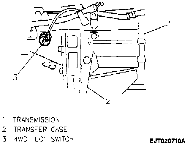 4. Checks that 4L switch closes (grounding 4L signal circuit) when transfer case is set in 4L.