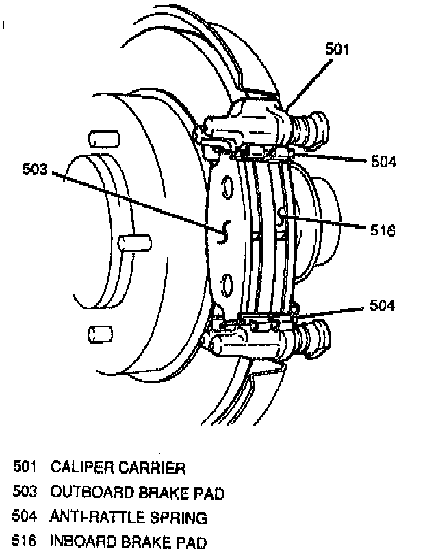 7. Caliper assembly from caliper carrier. Suspend caliper with wire to prevent damage to the brake hose.