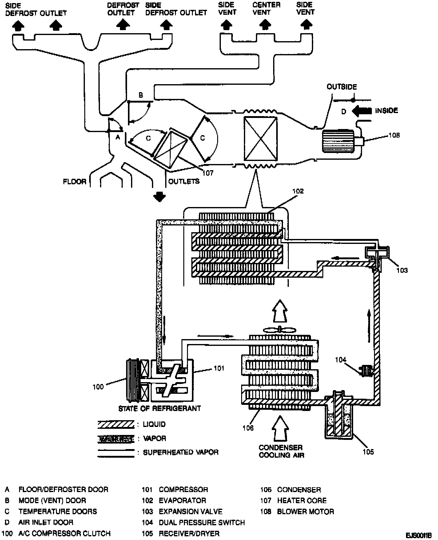 ^ De-energizes the compressor clutch in response to a high refrigerant pressure signal (from the dual pressure switch), a low refrigerant pressure signal (from the A/C dual pressure switch), a low evaporator temperature signal (from the evaporator temperature sensor), or a high engine demand signal (from the PCM).