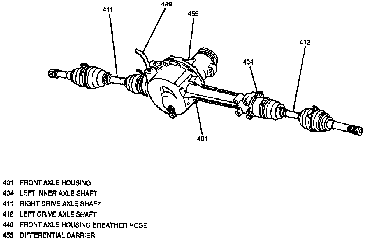 The front axle assembly consists of a front axle housing, differential carrier, a left inner axle shaft and the left and right drive axle shafts. The front axle housing is mounted to the vehicle frame. The differential carrier is mounted in the right side of the front axle housing. The front propeller shaft turns the differential assembly which transfers engine power to the right and left drive axle shafts. The front axle housing is sealed and contains a synthetic gear lubricant which lubricates the differential assembly, left inner axle shaft and its support bearing. The front axle housing is also vented to prevent excessive heat buildup.
