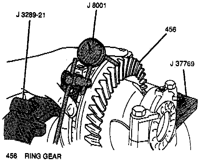 1. Install J 8001 to the differential carrier with the dial indicator plunger against a ring gear tooth.