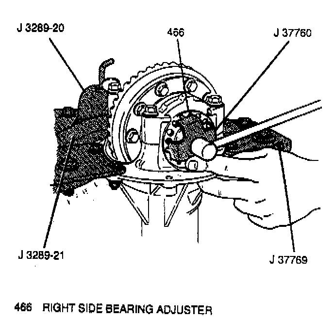 3. Observe J 8001 while moving the ring gear back and forth as described in Step 2. Differential backlash should be within 0.013 to 0.018 mm (0.005 to 0.007 inch). If differential backlash is above specification, loosen the left side bearing adjuster approximately 1/4 turn and tighten the right side bearing adjuster approximately 1/4 turn using J 37760. This will move the ring gear closer to the pinion gear causing a tighter mesh and less backlash. If differential backlash is below specification, loosen the right side bearing adjuster approximately 1/4 turn and tighten the left side bearing adjuster approximately 1/4 turn using J 37760. This will move the ring gear away from the pinion gear causing a looser mesh and more backlash. Use this procedure until the most accurate differential backlash is obtained.