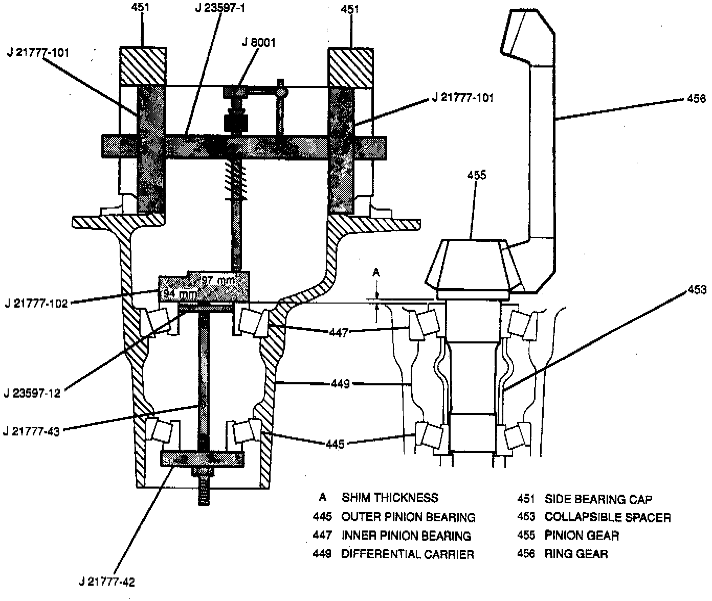 2. Place both inner and outer pinion bearings into the differential carrier and install J 21777-102, J 23597-12, J 21777-43 and J 21777-42.