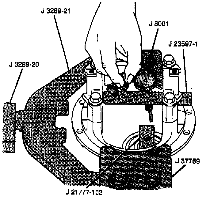 13. Slowly rotate J 23597-1 until the spring loaded plunger extension is no longer making contact with J 21777-102.