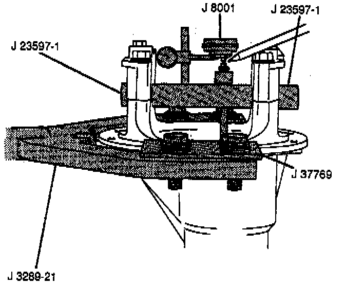 8. Install J 8001 to J 23597-1 and position J 8001 plunger over the spring loaded plunger extension and slightly load the J 8001.