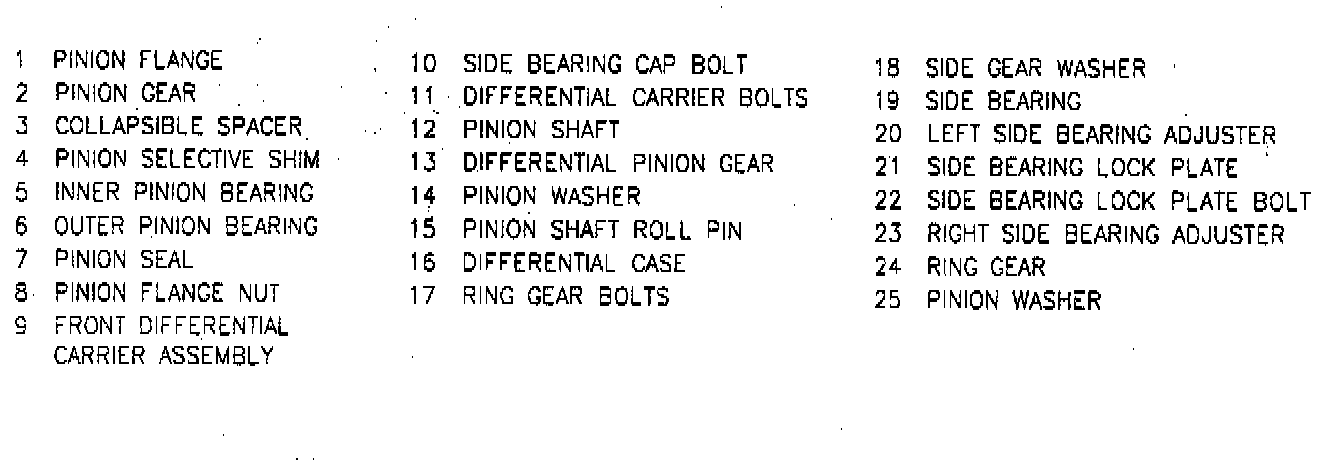 17. Pinion shaft roll pin, pinion shaft, differential pinion gears, washers and side gears with selective washers from differential case.