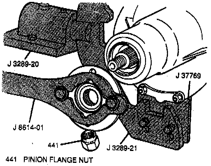10. Pinion flange nut from pinion gear using J 8614-01 to hold the pinion flange stationary.