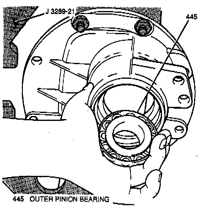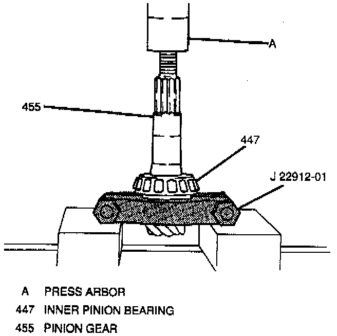 18. Inner pinion bearing and collapsible spacer from pinion gear shaft using J 22912-01. Place J 22912-01 on the pinion gear shaft with the concave side toward the pinion gear. Then place the pinion gear in a hydraulic press and remove the inner pinion bearing.