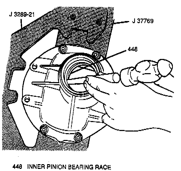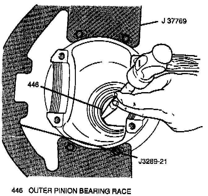 14. Inner and outer pinion bearing races from differential carrier using a large drift punch and hammer. Tap around the rear of each bearing race and slowly drive each race out evenly.