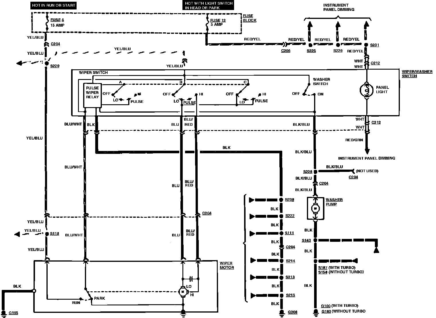 When the wiper switch is on low, battery voltage is applied to the wiper motor through the blue wire. When the wiper switch is in high, battery voltage is applied directly to motor through the blue/red wire to the high speed brushes.