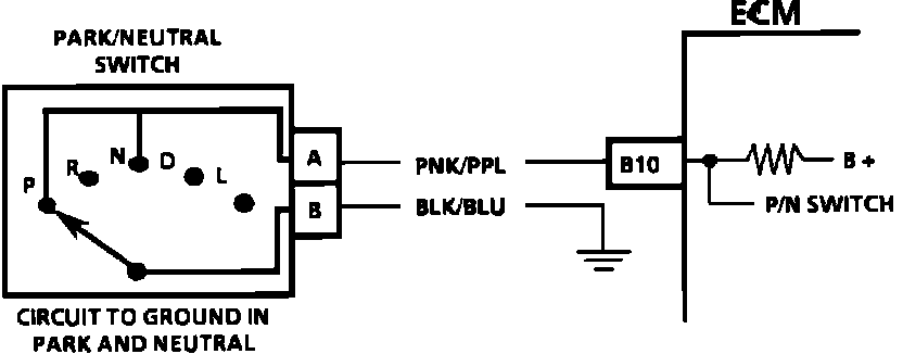 The Park/Neutral switch contacts are a part of the Neutral start switch assembly. They are closed to ground in Park or Neutral and open in drive ranges. The ECM supplies voltage through a current limiting resistor to PNK/PPL wire and senses a closed switch when the voltage on PNK/PPL wire drops to less than one volt. The ECM uses the P/N signal as one of the inputs to control idle air, VSS diagnostics, and EGR. If PNK/PPL wire indicates P/N (grounded), while in drive range, the EGR would be inoperative, resulting in possible detonation. If PNK/PPL wire indicates drive (open), a dip in the idle may exist when the gear selector is moved into drive range.