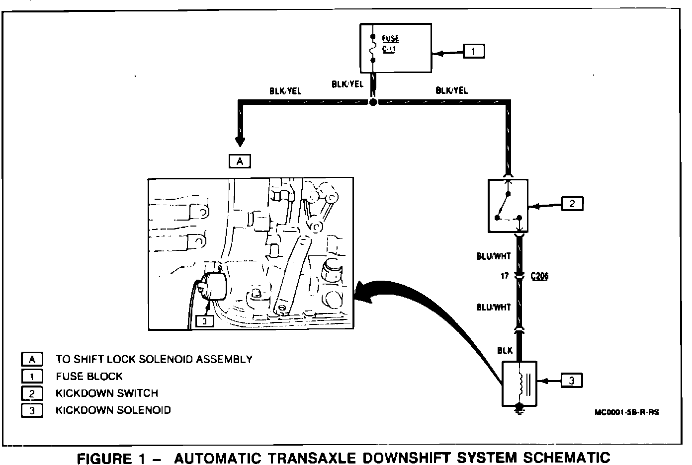During cruise conditions, when throttle angle is changed sufficiently to cause a 3-2 downshift (or a 2-1 downshift), the accelerator pedal strikes the plunger on the kickdown switch. When the plunger is pressed down, the switch closes and applies battery voltage through fuse C-11 and the kickdown switch to the kickdown solenoid. When battery voltage is applied, the kickdown solenoid energizes and opens the kickdown valve in the transaxle. With the kickdown valve opened, hydraulic pressure is rerouted to either the 2nd-3rd or 1st-2nd shift valve, causing the appropriate downshift to occur.