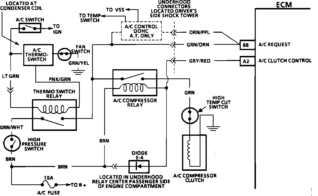 This signal tells the ECM that the A/C selector switch is turned "ON." The ECM uses this to adjust the idle speed, before turning "ON" the A/C clutch. If this signal is not available to the ECM, the A/C compressor will be inoperative.
